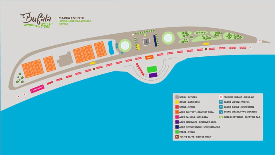 Ecco la mappa del Bufala Fest con l’indicazione degli stand, delle casse e dei servizi.