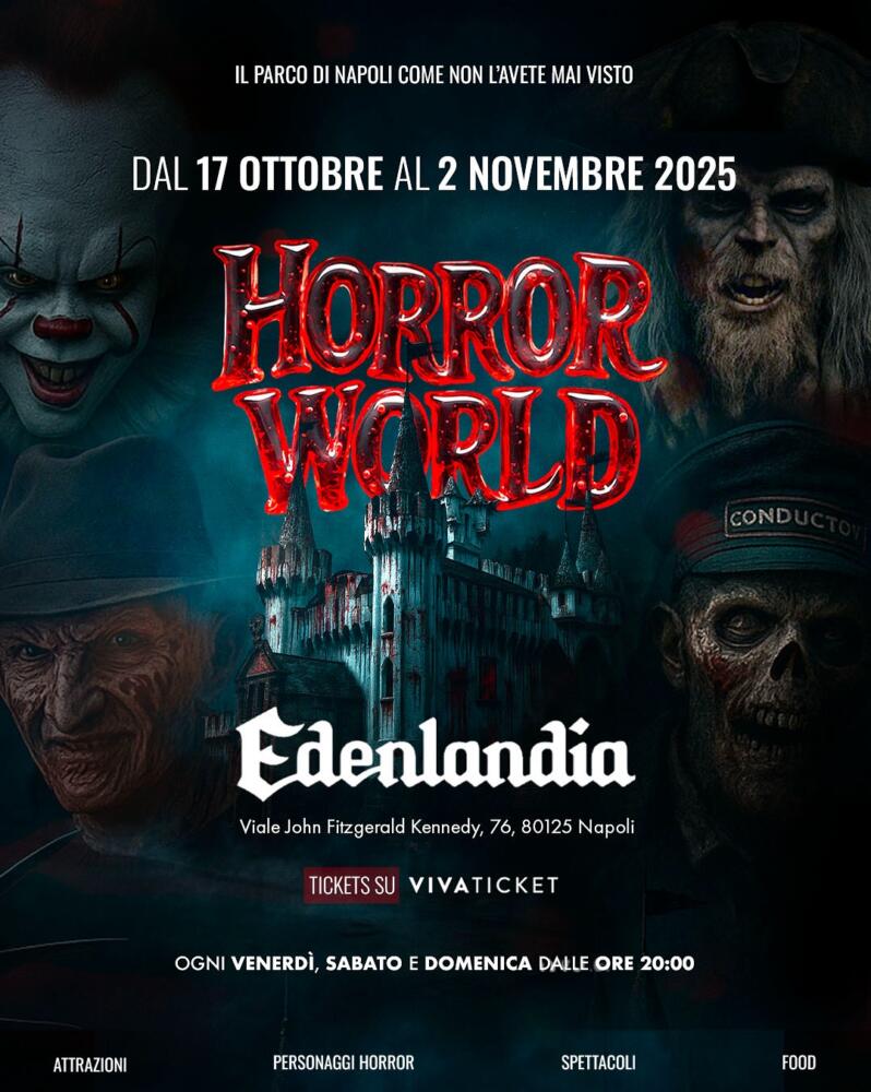 Edenlandia si prepara a un autunno da brividi con l’arrivo di HorrorWorld 2025, l’evento che trasforma il parco di viale Kennedy in un villaggio infestato. A partire da venerdì 17 ottobre, e per tre fine settimana consecutivi fino alla notte di Halloween del 2 novembre, il divertimento lascia spazio al terrore, in un’esperienza immersiva pensata per adulti e famiglie. L’iniziativa, promossa dal patron Gianluca Vorzillo, nasce come spin-off stagionale del parco, con ingresso gratuito e un format che alterna spettacoli, performance dal vivo e attrazioni a tema horror.