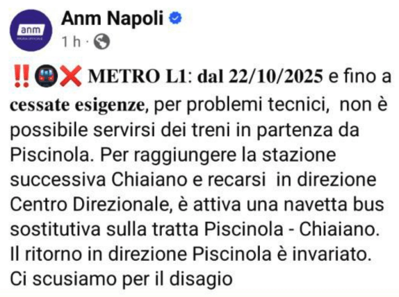 Aggiornamento: sulla Linea 1 ci sono ancora disagi per i treni in partenza da Piscinola, rinnovata anche per il 23 Ottobre la navetta