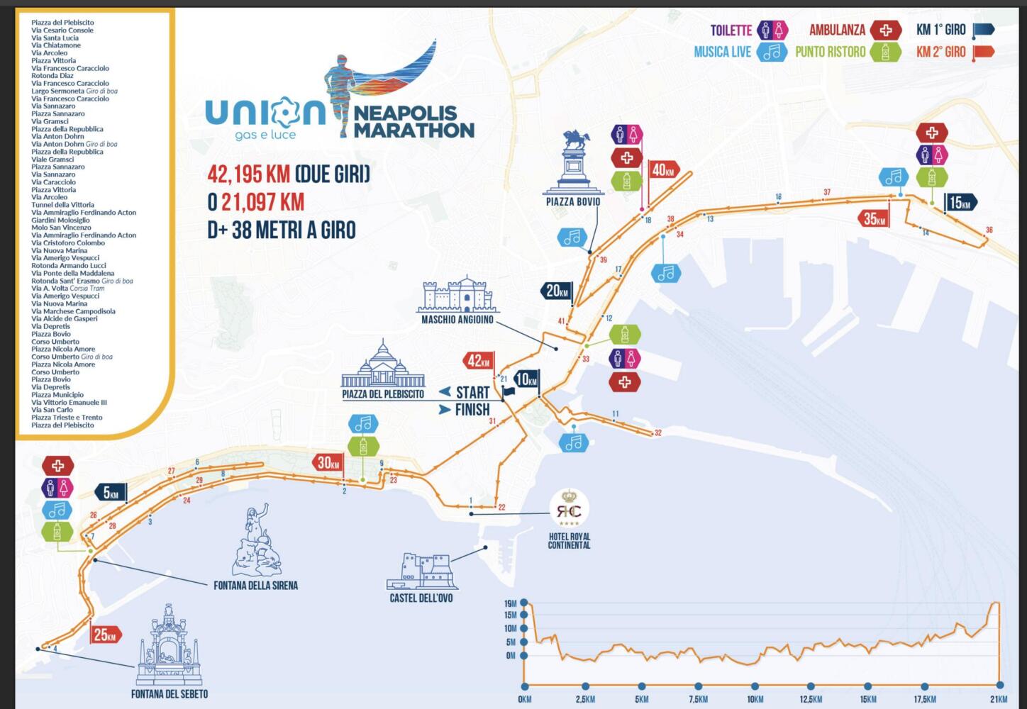 Il percorso della Neapolis Marathon 2025 è stato misurato e omologato da FIDAL. Si sviluppa lungo due giri da 21,097 km ciascuno, con un dislivello positivo di 38 metri a giro. La partenza e l’arrivo sono fissati in Piazza del Plebiscito, cuore pulsante della città. La gara attraversa alcuni dei luoghi più rappresentativi di Napoli, garantendo ai runner uno scenario unico tra storia, arte e mare. Ecco nel dettaglio il tracciato completo: