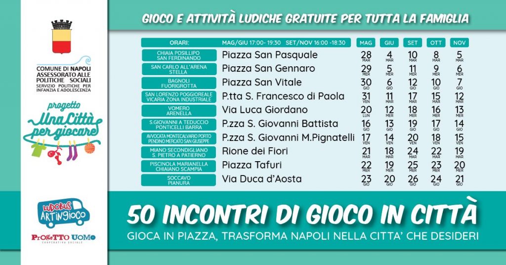 Il progetto, che parte il 16 maggio 2019 e quest’anno alla sua seconda edizione, si chiama Una Città per Giocare ed è un’iniziativa a cura dell’Assessorato alle Politiche sociali del Comune di Napoli, servizio politiche per l’infanzia e l’adolescenza. Esso coinvolge le dieci municipalità di Napoli con un fitto calendario di appuntamenti.